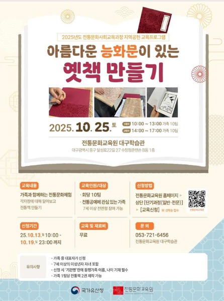 국가유산청 한국전통문화대학교 전통문화교육원(원장 김용구)은 오는 10월 서울·대구학습관에서 시민을 대상으로 가족과 함께 전통공예를 체험할 수 있는 「2025년도 하반기 전통문화사회교육과정 지역공헌 교육프로그램」을 운영한다.