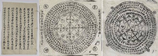 발견된 복장 유물 왼쪽은 '중수기문', 가운데와 오른쪽은 '보협진언·팔엽삼십칠존만다라' 2종 국가유산청 제공