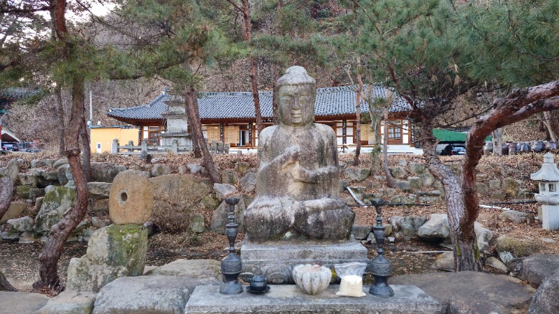 대웅전 입구에는 대구광역시 유형문화유산으로 지정 되어있는 군위삼존석굴 석조비로자나불좌상이 있다. 석조 비로자나불 좌상은 삼존 석불이 모셔진 이후인 9세기경에 만들어졌다. 당시에 유행하던 신라 비로자나불상의 전형적인 모습을 하고 있기 때문에 불상의 변천과 신앙 추이를 확인할 수 있다. 불상은 결가부좌를 하고 통견식의 법의를 입고 있다. 양쪽 어깨에 법의가 조금씩 걸쳐져 있어 앞가슴이 넓게 드러나 있다. 두 팔을 타고 내려온 웃 주름은 두 무릎에서 다시 물결무늬를 만들고 있다. 수인은 지권인이며 목에는 삼도가 있다, 두 뺨은 풍만하며 귀가 길게 늘어져 있고, 머리는 소라 껍데기처럼 말린 모양이며, 육계는 편평하다. 원래는 파괴된 대좌와 함께 지금의 위치에서 약 30m 북쪽에 있었으나, 1990년 대웅전을 늘려지으며 대좌와 불단을 새로 만들고 현재 자리로 옮겼다.