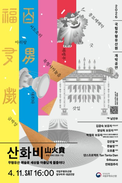 국가유산청 국립무형유산원(원장 박판용)은 <2026년 개막공연 산화비(山火賁)>(부제: 무형유산 예술로 세상을 아름답게 물들이다)를 오는 4월 11일(토) 오후 4시, 국립무형유산원 얼쑤마루 대공연장(전북 전주시)에서 개최한다.