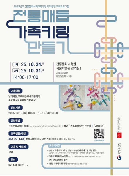 국가유산청 한국전통문화대학교 전통문화교육원(원장 김용구)은 오는 10월 서울·대구학습관에서 시민을 대상으로 가족과 함께 전통공예를 체험할 수 있는 「2025년도 하반기 전통문화사회교육과정 지역공헌 교육프로그램」을 운영한다.