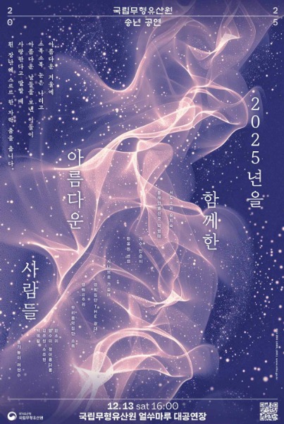 국가유산청 국립무형유산원(원장 박판용)은 12월 13일(토) 오후 4시, 국립무형유산원 얼쑤마루 대공연장(전북 전주시)에서 올 한 해 공연을 마무리하며 관객들에게 감사의 마음을 전하는 송년공연 <2025년을 함께한 아름다운 사람들>을 개최한다.