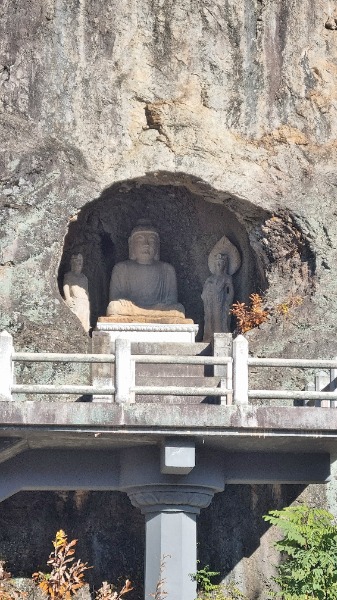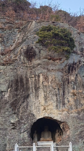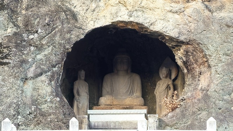 군위 아미타여래삼존 석굴(국보)은 거대한 동남 방향 천연절벽 자연 동굴 안에 삼존불을 모셨는데 석굴 입구는 둥근 모양이고, 내부 바닥은 네모지게 반듯한 모양으로 평평하다.
