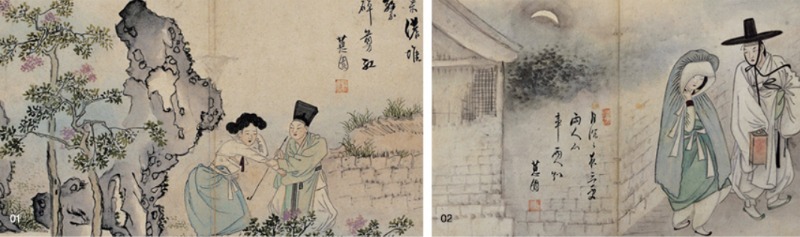 그림 속 연애는 말보다 먼저 ‘풍경’에 흔적을 남긴다. 문 앞에 가지런히 놓인 신발만으로도 누군가를 기다리는 마음이 드러나고, 손목을 잡는 동작 하나에 순수한 설렘과 달콤한 욕망이 동시에 배어 나온다. 달빛 아래 나란히 걷는 두 사람의 모습은 연애의 가장 다정한 순간을 보여주지만, 골목 안쪽의 밀회 장면은 관계의 민낯을 숨기지 않는다. 혜원 신윤복의 화면은 오래전의 것이지만 그때에도 연애가 얼마나 쉽게 설렘에서 대담으로, 은근에서 노골로 넘어가는지 조용히 증명한다.