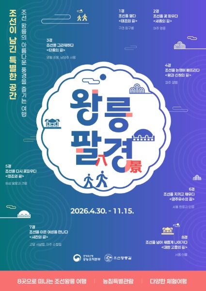 국가유산청 궁능유적본부는 오는 4월 30일부터 11월 15일까지 총 34회에 걸쳐 유네스코 세계유산인 조선왕릉을 돌아보는 ‘조선왕릉길 여행프로그램’ 「왕릉팔(八)경」을 운영한다. 올해로 6회를 맞이하는 이 행사는 명사 및 전문 강사와 함께 여덟 곳의 조선왕릉과 궁궐 및 지역문화를 탐방하는 여행 프로그램이다.