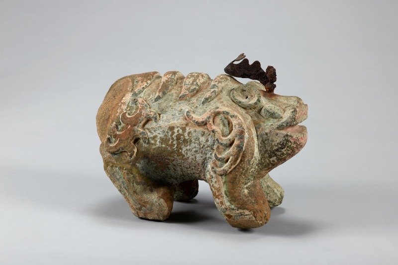 기괴한 신수를 표현한 공상적인 동물을 무덤 안이나 앞에 놓아서 악귀(惡鬼)를 쫓아 사자(死者)를 수호한다는 중국의 묘장풍습(墓葬風習)에서 나온 것이다. 출토당시 무령왕릉 널길 중앙에 밖을 향하여 놓여 있었다. 뭉뚝한 입을 벌리고 있고 코는 크지만 콧구멍이 없으며, 등에는 네 개의 융기(隆起)가 있고 머리 위 융기 상면의 패어진 홈에는 나뭇가지 모양의 철제 뿔이 꽂혀 있다. 몸통 좌우에는 앞뒤로 날개모양의 갈기가 도안처럼 부조되었다. 네 개의 짧은 다리가 있으며 발톱이 표현되어 있는데 뚜렷하지 않다.