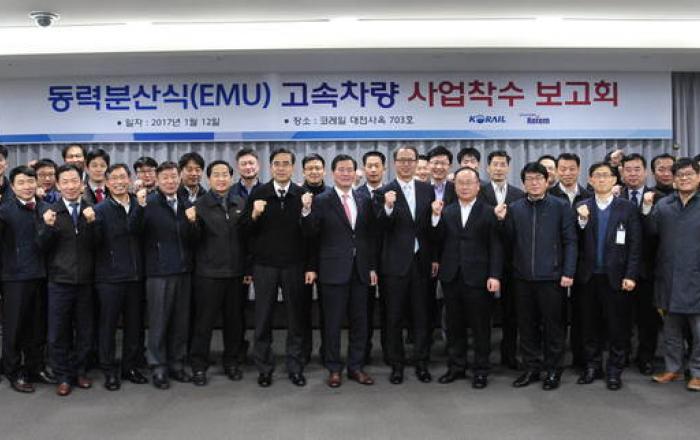 현대로템이 지난해 한국철도공사로부터 수주한 동력분산식 고속열차 제작 사업에 본격 착수했다. 현대자동차그룹의 종합중공업회사 현대로템은 12일 한국철도공사 대전 본사에서 코레일 정현우 차량기술단장, 안병호 운전기술 단장, 김진돌 엔지니어링센터장 등을 비롯해 현대로템