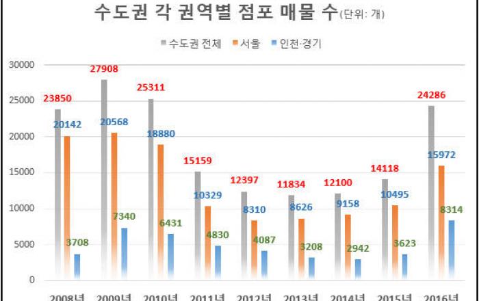 수도권 소재 점포 평균 권리금이 역대 최저치를 기록한 것으로 나타났다. 자영업자 간 점포거래소 점포라인이 자사 DB에 등록된 수도권 소재 점포매물 2만 4,286개를 조사한 결과 평균 권리금은 전년대비 3.56% 하락한 8,510만원으로 집계됐다. 이는 점포라인이