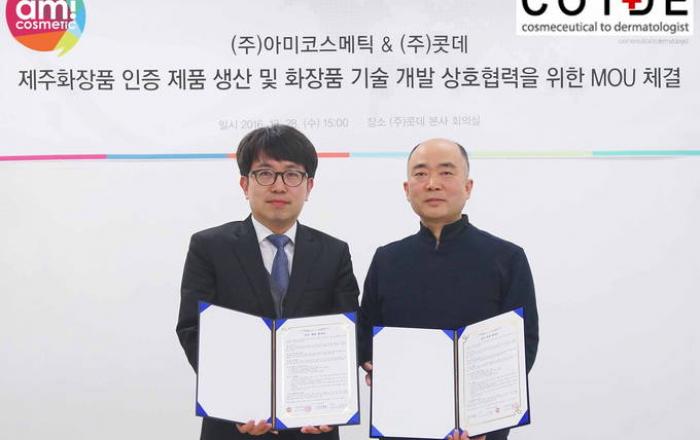 글로벌 화장품 전문 기업 ㈜아미코스메틱이 12월 28일(수) 충남 천안에 위치한 ㈜콧데 본사에서 천연 유기농 화장품 생산 판매업체 ㈜콧데와 ‘제주화장품 인증 제품 생산 및 화장품 기술 개발 상호 협력을 위한 업무협약(MOU)을 체결했다고 밝혔다. 이번 MOU 체