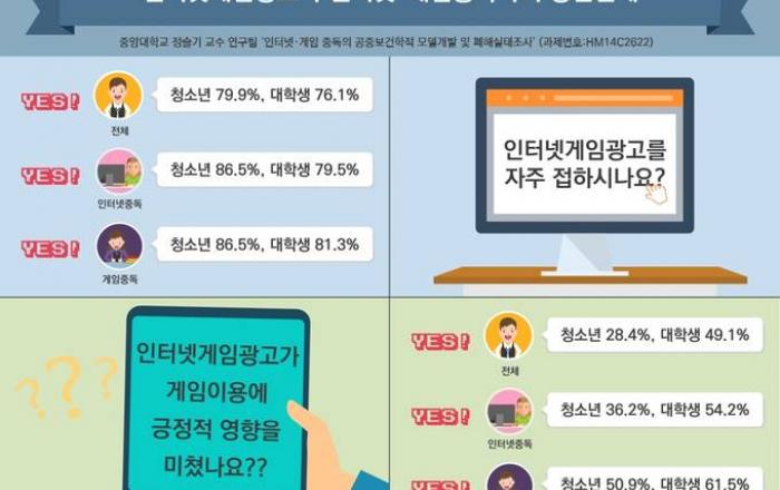 청소년들이 게임광고를 자주 접하고 더 많이 기억할수록 인터넷중독의 위험성이 1.4배 증가하는 것으로 나타났다. 중앙대학교의 정슬기 교수 연구팀이 발표한 ‘인터넷·게임 중독의 공중보건학적 모델개발 및 폐해실태조사’(보건복지부 정신건강기술개발사업단 연구사업과제번호: HM