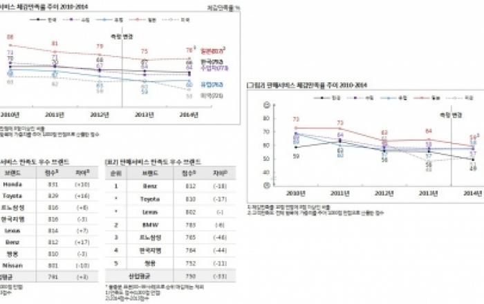 수입차는 전반적으로 국산차에 비해 경쟁력이 있다. 국산차가 상대적으로 선방하고 있는 것은 서비스 영역이다. 애프터서비스 부문은 근소한 차이로 앞서고, 판매서비스 부문에서는 뒤지고 있다. 수입차 중에서는 일본차가 두 부문 모두에서 발군의 성적을 낸 반면, 유럽차의 A/S