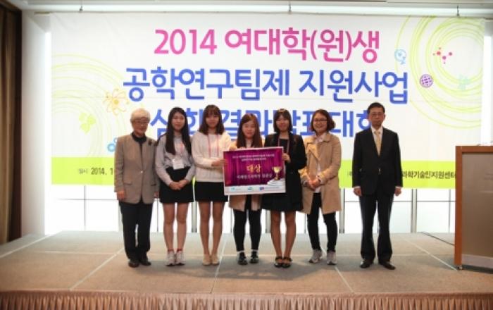 한국여성과학기술인지원센터(소장 이혜숙)는 ‘2014 여대학(원)생 공학연구팀제’ 심화팀 결과발표대회에서 채은정(중앙대학교)팀이 대상인 미래창조과학부 장관상을 받게 됐다고 13일 발표했다. 여자 대학원생과 대학생들로 팀을 구성해 스스로 정한 공학 연구과제를 수행하는 이