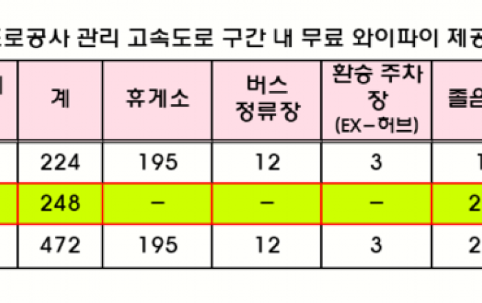 25일부터 전국 고속도로 모든 휴게공간에“무료 와이파이”졸음쉼터․주차장 휴게소등 248개소에서 통신사 상관없이 100Mbps 제공 □ 25일부터 한국도로공사가 관리하는 전국 고속도로의 모든 휴게공간에서 무료 와이파이(Wi-Fi) 서비스가 제공된다. 통신사에 상