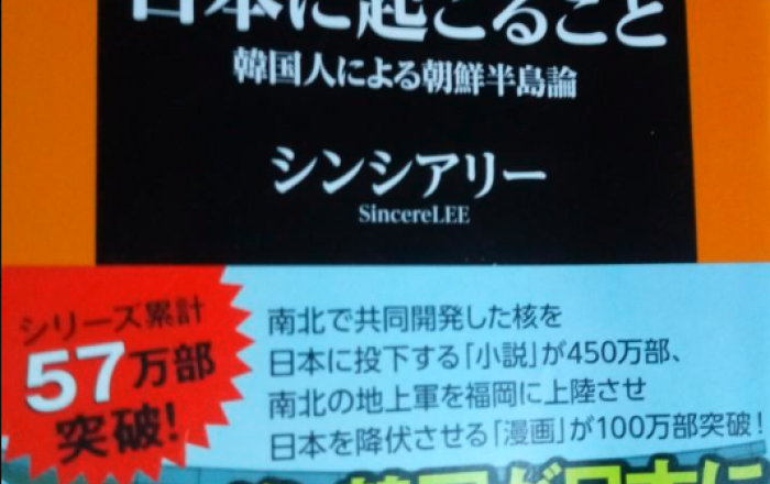 화제의 일본책과 작가소개책명 : 조선반도 통일후에 일본에 일어나는 것 한국인에 의한 조선반도론작가 : 신시아리 SincereLEE57만부 돌파 통일 대한민국을 보는 일부 일본인의 시각.통일후 한국이 일본에 미사일을 쏜다.한국은