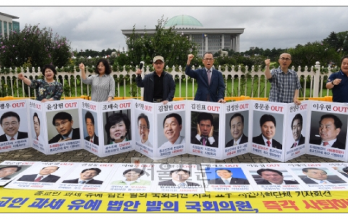 “종교인 과세 유예법안 발의 국회위원들은 사퇴하라”종교자유정책연구원 납세자연맹 등 사퇴요구 기자회견리얼미터 여론조사 “78.1%가 과세 찬성, 반대는 14.2% 종교자유정책연구원과 한국납세자연맹과 등 시민사회단체 회원들이 24