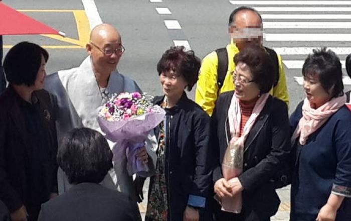 명진스님과 세월호·용산 참사 유가족들. 유가족들이 이날 법회에 동참했고, 명진스님은 이들을 참석대중들에게 소개했다.명진스님(단지불회 회주, 전&