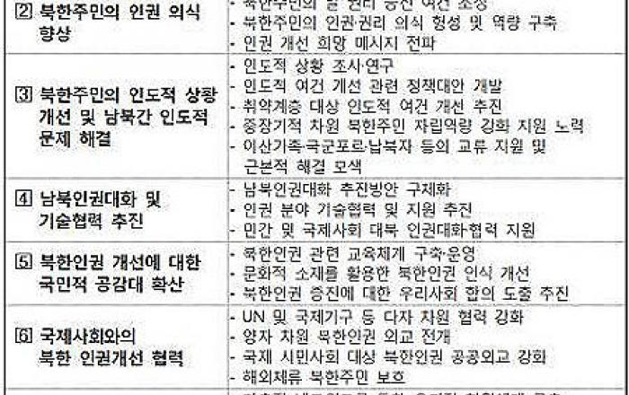 통일부는 ‘북한주민의 인권 보호 및 증진을 통한 통일시대 기반 구축’이라는 비전 아래 ▲북한주민의 인간다운 삶의 실질적 증진 ▲북한 당국의 정책 노선을 인권·민생 친화적으로 전환 ▲북한인권 증진 과정을 통한 남북 간 동질성 회복 등 3대 목표를 설정했다. 정책 추진방향