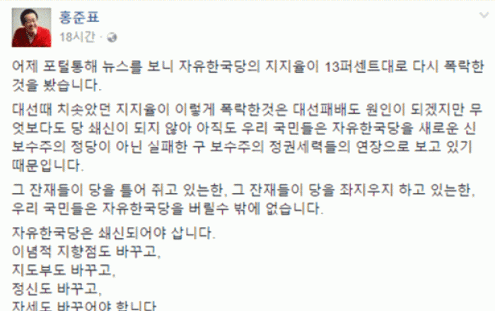 홍준표 “한국당, 전투적 야당 조직으로 바꿔야대선 패배 후 미국으로 출국한 자유한국당 홍준표 전 대통령 후보는 “자유한국당을 전투적 야당조직으로 바꿔야 한다”고 주문하고 “이를 성공적으로 이루지 못하고 구 보수주의 잔재들이 설치는 당으로 방치하게 되면 한국 보수우파의