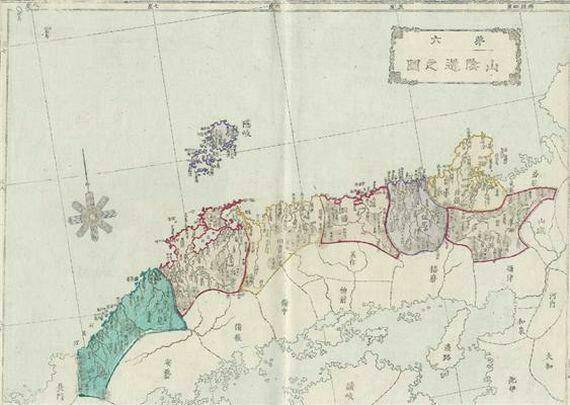 당시 일본의 지리부도인 ‘일본지지략부도’(1876년판)에 수록된 ‘산음도지도(山陰道之圖)’를 살펴보면 일본에서 독도와 가장 가까운 섬인 오키(隱岐)섬, 시마네(島根)현을 보라색과 황색으로 표시했다.