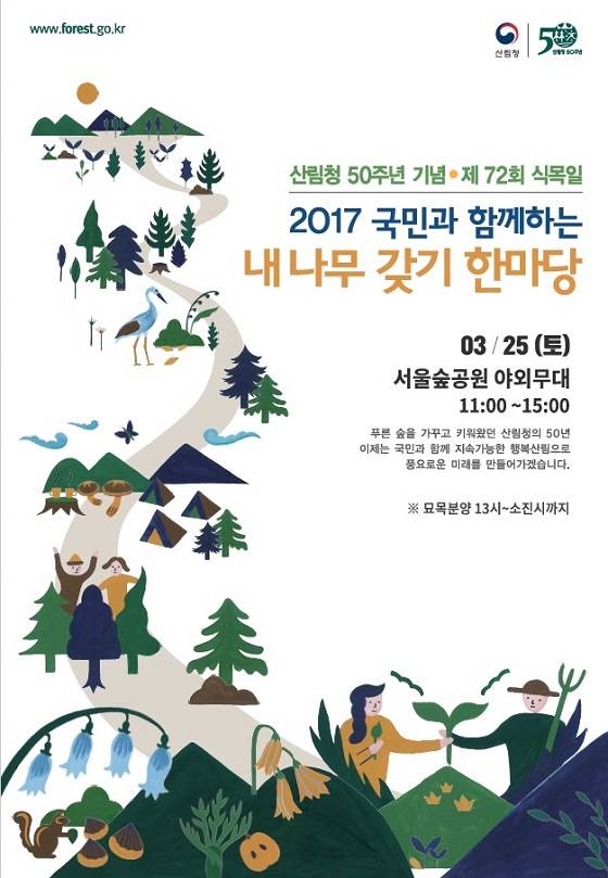 ‘나무와 사람이 함께한 50년’을 주제로 신원섭 산림청장 등이 참석해 나무를 나눠주고 내나무 갖기에 대한 국민 소통 시간도 가질 예정이다.