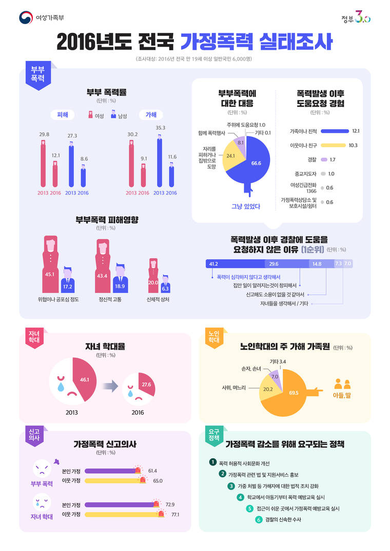 여성가족부(장관 강은희)는 ’2016년 가정폭력 실태조사’ 결과를 26일(일) 발표했다.