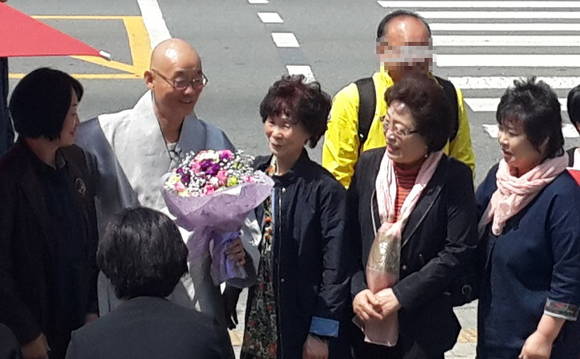 명진스님과 세월호·용산 참사 유가족들. 유가족들이 이날 법회에 동참했고, 명진스님은 이들을 참석대중들에게 소개했다. |