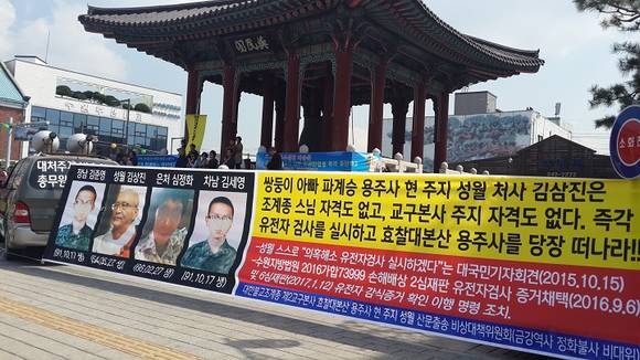 용주사신도비대위는 법회가 열린 여민각 주변에 성월스님의 은처자 의혹을 제기하는 현수막을 설치했다. |