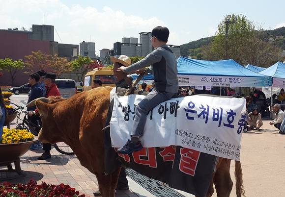 법회가 열리는 동안 은처승 비호하는 자승 총무원장의 사퇴를 촉구하는 현수막을 두른 황소가 화성행궁 광장을 거닐고 있다. |