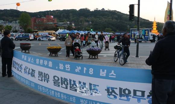 명진스님의 거리 법회가 끝난 뒤, 오후에는 직선제 실현을 촉구하는 촛불법회가 이어졌다. ‘총무원장 직선 실현을 위한 대중공사’는 오후 5시 30분부터 같은 장소에서 총무원장 직선제 실현을 촉구하는 4차 촛불법회를 봉행했다. 건너편 화성 행궁에서는 연등축제 준비가 한창이었다.