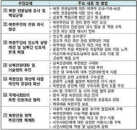 이에 따라 구체적 추진과제로는 ▲북한 인권실태 조사 및 책임규명 ▲북한주민 인권 의식 향상 ▲북한주민 인도적 상황 개선 ▲남북인권대화 및 기술협력 등 7개 과제를 설정했다.