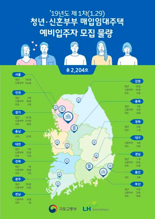 국토교통부(장관 김현미)는 1월 29일부터 전국 83개 지역(시·군·구)에서 청년과 신혼부부를 위한 매입임대주택 2,204호, 신혼부부를 위한 전세임대주택 5,700호에 대한 입주자 모집을 시작한다.