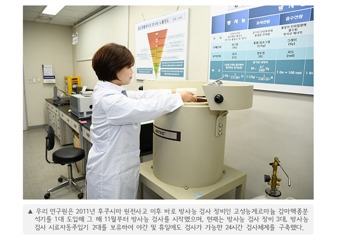 셋째, 우리 연구원은 2011년 후쿠시마 원전사고 이후 바로 방사능 검사 장비인 고성능게르마늄 감마핵종분석기를 1대 도입해 그 해 11월부터 방사능 검사를 시작했다. 2019년 현재는 방사능 검사 장비 3대, 방사능 검사 시료자동주입기 2대를 보유하여 야간 및 휴일에도 검사가 가능한 24시간 검사체계를 구축했다. 방사능 검사는 『식품공전』에 따라 요오드와 세슘 항목을 1건당 1만초 분석하며, 연간 총 1,500건을 검사하고 있다. 검사 대상은 서울시내 유통 식품과 어린이집 및 학교급식 식재료 등이며 특히 서울시와 시민단체의 합동 기획검사, 시민 방사능 검사 청구제를 통해 시민들이 함께 참여하고 있다. 검사결과는 서울시홈페이지(https:// health.seoul.go.kr/nuclear)에 공개하여 누구나 확인할 수 있다. 또한 우리 연구원 자체 기획검사로 방사능물질 오염 우려제품에 대한 집중검사를 실시하여 서울시 식품 방사능 안전관리 시책자료로 제공하고 있다.