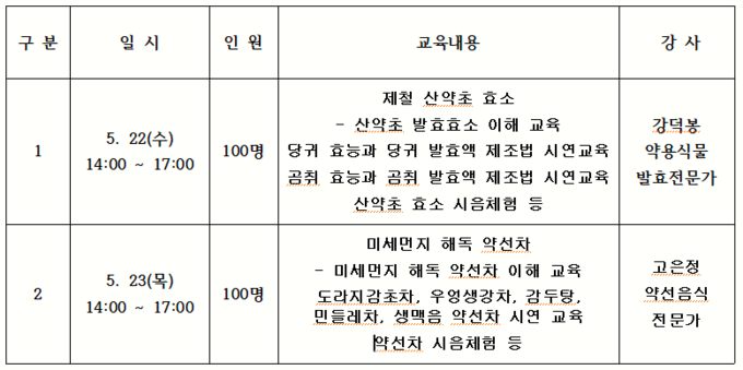 □ 5월 22일(수)에는 건강관리에 좋은 제철 산약초 효소 강좌에는 △산약초 발효효소 이해교육 △당귀, 곰취 효능과 발효액 제조법을, 23일(목)에 진행되는 약선차 강좌에서는 △약선차 이해교육 △미세먼지 해독에 좋은 약선차(도라지감초차, 감두탕 등 5종)만들기가 진행된다.
