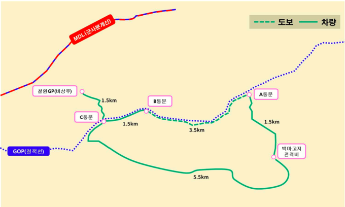 * 전체 거리 15㎞(3시간 소요): 백마고지 전적비 → 에이(A)통문(차량 이동 1.5㎞) → 비(B)통문(도보 이동 3.5㎞, 80분) → 시(C)통문(차량 이동 1.5㎞) → 비상주 감시초소(GP, 차량이동 1.5㎞) → 시(C)통문(차량이동 1.5㎞) → 백마고지 전적비(차량 이동 5.5㎞)