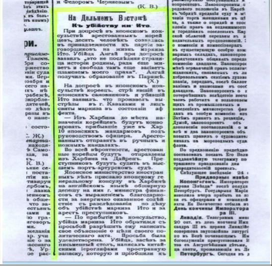 하얼빈, 10월 13일(10월 26일) 아침 9시에 최전선 열병식에 참석하기 위하여 러시아 재무장관 코코브체브이와 러시아 지도자들이 이토 공작과 함께 기차 칸에서 내리는 순간, 내국인들과 외국 영사들이 있는 쪽 마지막 등쪽, 브라우닝 권총으로부터 몇 발의 총알이 발사되었고, 이토 공작은 치명적 총상을 입었고, 남만주철도개발대표 다나카는 발에 작은 상처를, 하얼빈 일본총영사 카와카미는 중상이나 생명에는 지장이 없으며, 황궁 개인비서대신 모리는 경상을 입었다. 조선인으로 밝혀진 체포되었고, 심문에 응했으며, 자신의 조국을 위하여 공작을 살해하기 위하여 특별히 도착하였으며 공작이 조선에 있는 동안 자신의 친지들을 몇명 사형에 처했다고 하였다. 이번 사건을 분명히 사전에 계획한 것이었다.