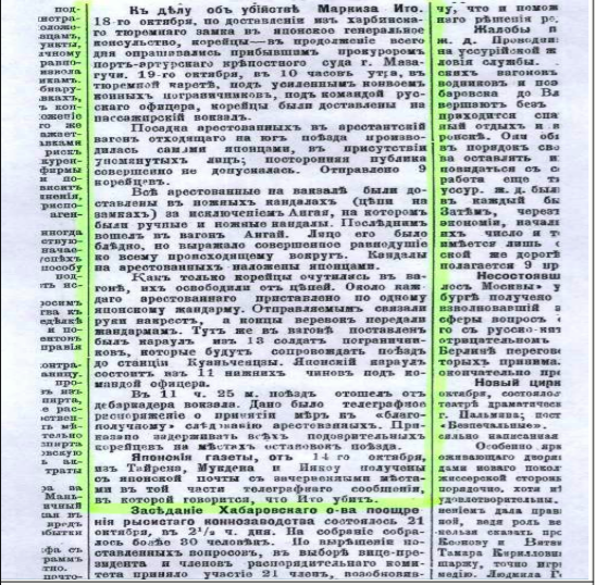 어제 차이쟈고우 역에서 러시아경찰은 브라우닝 권총을 소지한 3명의 조선인을 체포하였으나 위험을 사전에 경고하기는 어려웠다고 한다. 왜냐하면 전날, 총영사 카와카미가 철도청에 요청하기를 모든 일본인들이 자유롭게 출입하도록 요청하였다는 것이다. 외모상으로 범인을 일본인과 구분하기는 절대 불가능하였다. 공작을 수행한 모든 러시아 시민들도 똑같은 위험을 감수해야 했다. 공작과 중상을 입은 일본인들과 매우 가까운 거리에 있던 재무장관은 부상을 당하지 않았다. 오늘 공작의 시신은 재무장관과 철도청 대표의 조의 화환을 관 위에 얹고 남쪽으로 향했다. 모든 거리에는 애도가 이어졌다. 북경주재 러시아 대사 코로스토베츠는 직접 공작의 시신을 관첸츠이까지 운구하였다. 그의 명령에 따라 묵젠과 달리니에서는 모든 러시아 외교관들이 시신을 맞이하였다. 재무장관은 동경주재 러시아 대사를 통하여 일본 정부에 비통한 심정을 전하였다.