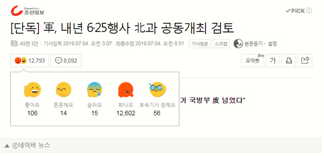 '빅터뉴스'가 4일 네이버 뉴스에 하루간 쏟아진 기사들을 워드미터로 분석한 결과 <조선일보>의 "[단독] 軍, 내년 6·25행사 北과 공동개최 검토" 기사에 총 1만2305개의 '화나요'가 남겨지며 최다 '화나요' 기사로 꼽혔다. 이어 '좋아요' 103개, '후속기사 원해요' 54개, '훈훈해요' 13개, '슬퍼요' 15개 순이었다.