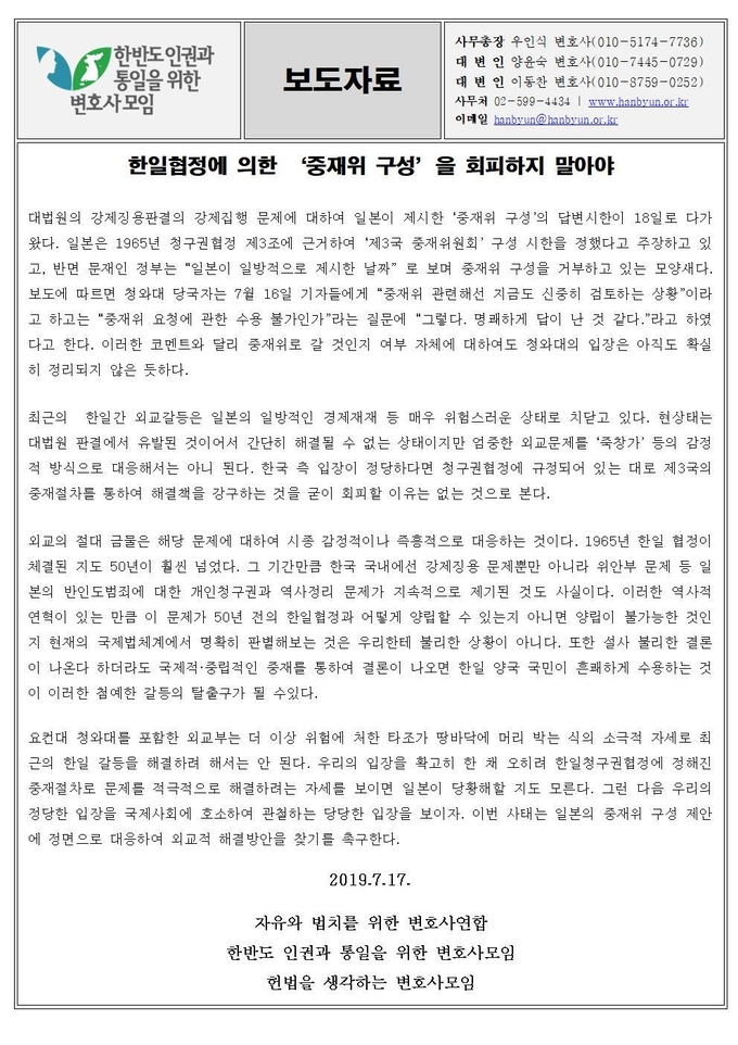 한일협정에 의한 ‘중재위 구성’을 회피하지 말아야 유시문 기자 발행 2019-07-18 21:16 Facebook Twitter band 네이버블로그 카카오스토리 카카오톡 글자작게 글자크게 한일협정에 의한 ‘중재위 구성’을 회피하지 말아야 <저작권자 ⓒ 한국역사문화신문, 무단 전재 및 재배포 금지> 유시문 기자 다른기사보기