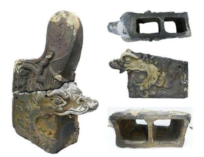 <조선 시대 궁궐 지붕의 장식기와(창경궁 명정문)과 발견된 취두(아랫부분)의 옆, 위, 아래 모습