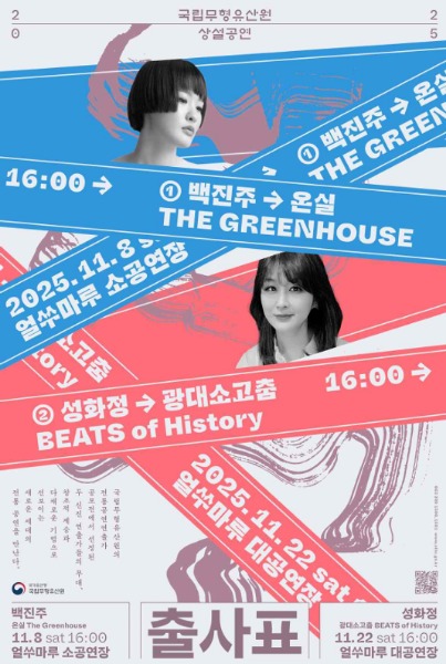 국가유산청 국립무형유산원(원장 박판용)은 오는 11월 8일(토) 오후 4시 국립무형유산원 얼쑤마루 소공연장(전북 전주시)에서 「2025 전통공연 연출가 발굴공모전 ‘출사표’」의 선정작으로 백진주의 <온실> 공연을 선보인다.