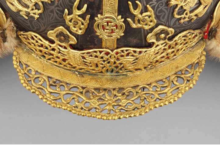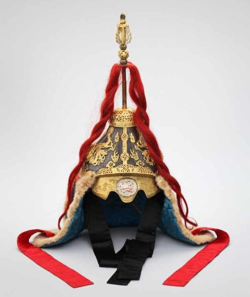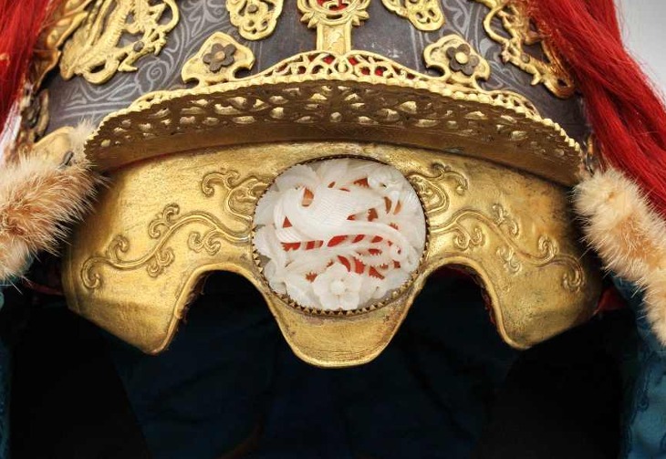 투구는 정수리 장식, 투구감투, 목을 보호하기 위한 드림 부분으로 구성되는데, 위가 뾰족한 반구형을 띠는 감투 부분은 금속 바탕에 은입사(銀入絲)로 무늬를 장식하고, 앞뒤 양옆에 금속으로 세밀하게 제작한 봉황과 사조룡 형상을 부착하였다. 감투 앞쪽에는 금속 차양을, 그 아래로는 눈 주위 곡선을 따른 형태의 이마가리개를 각각 부착하여 보호 기능을 강화하였으며, 중앙에 백한(白鷴, 꿩과의 조류)을 섬세하게 투각한 옥판을 부착하여 장식성을 높였다. 투구 위에 달린 기둥인 간주(幹柱) 역시 보주(寶珠, 보배로운 구슬)와 화염문(火焰文, 불꽃 무늬) 등 정교한 세부 장식이 돋보인다.