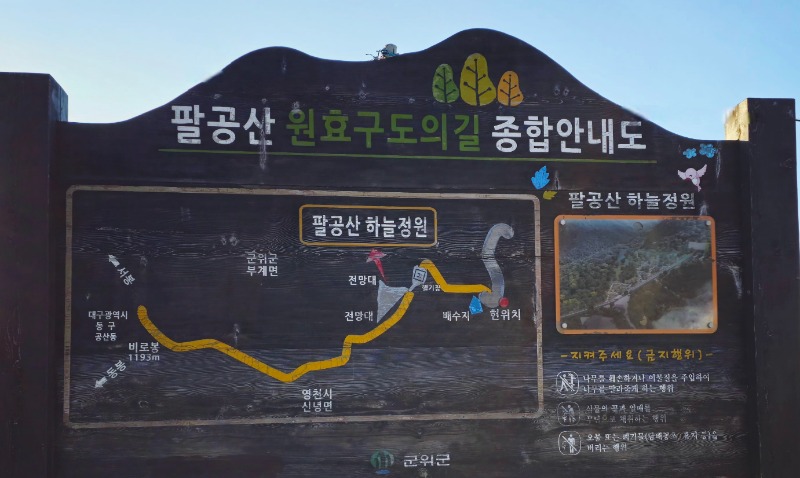 팔공산 하늘정원은 군부대 부지를 활용하여 공원을 조성한 정상 주변에 위치하며 하늘과 가까이 닿은 넓은 자연 학습장으로, 정자에 앉아 시원한 바람을 맞으며 주변 능선을 바라볼 수 있는 곳으로, 군위군과 영천시, 구미시 일대까지 한눈에 내려다 보인다