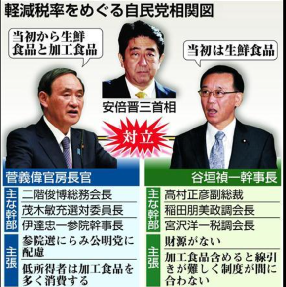 平成29年4月の消費税再増税と同時導入する軽減税率をめぐり、自民党が対象品目を加工食品にまで広げる方向にかじを切った。来夏の参院選での選挙協力をにらみ、菅義偉(すが・よしひで)官房長官は公明党に譲歩。自民党の二階俊博総務会長も首相官邸や公明党と歩調を合わせ、財政規律を守る観点から抵抗する谷垣禎一幹事長らの外堀は埋まっていった。