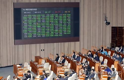 ▲ 지난 2일 밤 국회 본회의에서 북한의 인권 문제를 다룰 근거와 기구를 마련하는 내용의 북한인권법 제정안이 통과되고 있다. 여야 합의로 마련된 제정안은 이날 재석 의원 236명 가운데 찬성 212표, 기권 24표로 가결됐다. ⓒ 연합뉴스