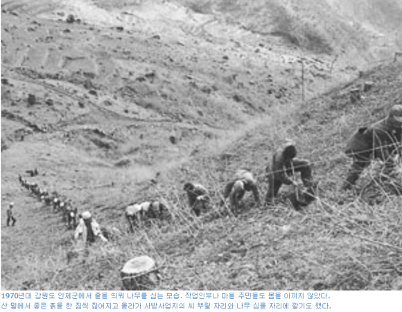 1970년대 강원도 인제군에서 줄을 띄워 나무를 심는 모습. 작업인부나 마을 주민들도 몸을 아끼지 않았다.