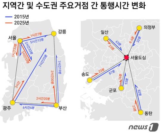 노선 구축이 완료될 경우 주요도시별 이동시간은 Δ서울~강릉 1시간7분 Δ강릉~부산 2시간30분 Δ광주~부산 2시간20분 등으로 크게 단축되는 등 전국이 2시간대 권역으로 들어서게 된다.