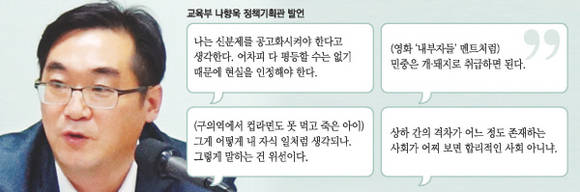 교육부 나향욱 정책기획관(47·사진)이 “민중은 개·돼지와 같다”며 “(우리나라도) 신분제를 정했으면 좋겠다”고 말했다. 지난 7일 저녁 서울 종로의 한 식당에서 경향신문 정책사회부장, 교육부 출입기자와 저녁을 함께하는 자리에서였다. 자리에는 교육부 대변인, 대외협력실 과장이 동석했다.