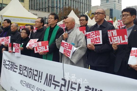 11월 10일 서울 광화문 광장에서는 불교, 기독교, 원불교, 천도교, 천주교 등 서로 다른 종교인들이 하나가 되는 보기 드문 광경이 펼쳐졌다. 지역에서 환경 문제 해결을 위해 애쓰고, 노동자들의 권익 향상을 위해 노력하고, 또 각 종교의 신도들을 위해 기도하던 이들이 한데 모여 한 목소리로 외쳤다. “박근혜는 즉각 퇴진하라.”
