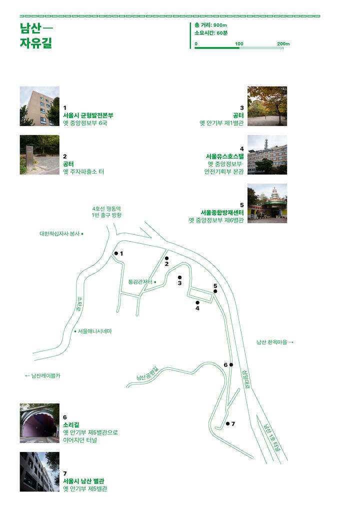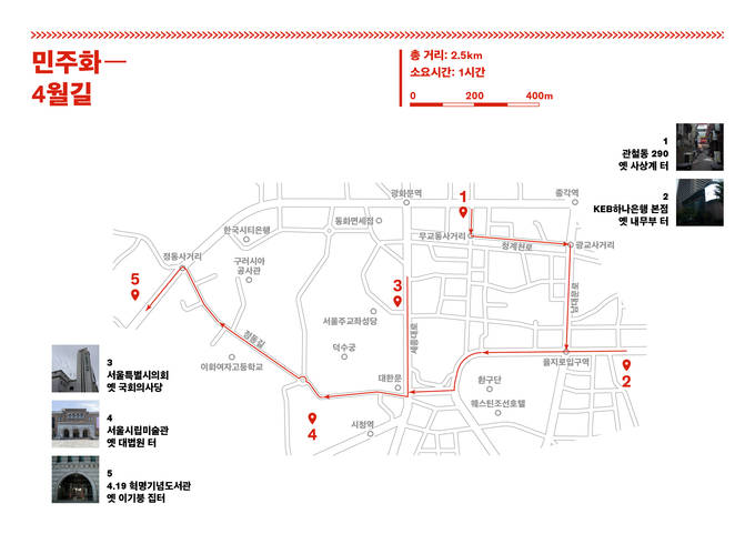 아울러 7개의 인권현장 도보 탐방 코스는 ①민주화(4월길, 6월길) ②노동(구로길, 전태일길) ③사회연대(여성길, 시민길) ④남산(자유길) 4개 테마로 분류된다. 각 코스마다 1시간~2시간 정도 소요되는 길이로, 해설사의 설명을 들으며 역사적 현장을 직접 밟아보는 특별한 체험을 할 수 있다.