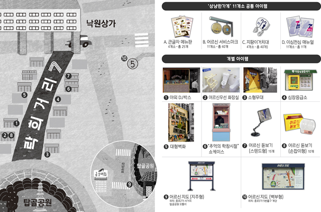 학창시절을 떠올리게 하는 소품들을 전시한 쇼케이스, 옛 DJ 다방을 연상시키는 ‘야외DJ박스’, 어르신들이 주변 상점에서 도움을 받을 수 있는 내용들을 알기 쉽게 표시한 ‘서비스마크’도 조성됐다.